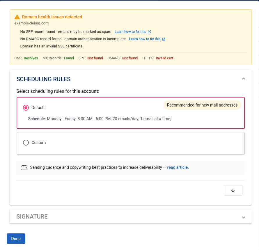 We run quick domain checks when you connect a sending account to flag missing SSL, MX, SPF, or DMARC records and guide you to fixes if needed.